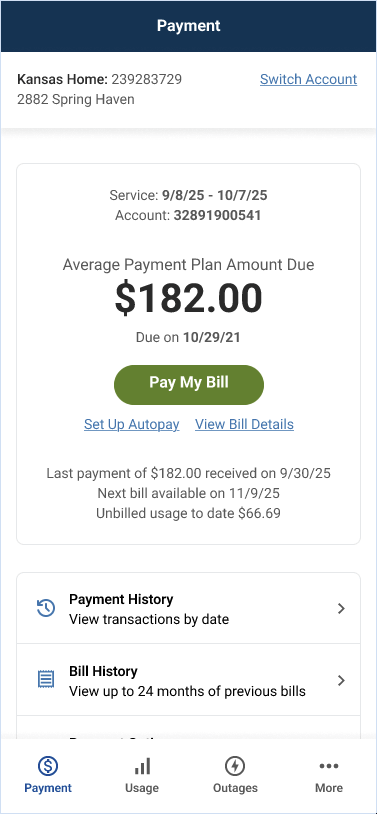 With no legacy structure to reference and multiple competing priorities, I had to determine what earned primary navigation versus what lived in secondary menus. I established a four tab structure: Payments, Usage, Outages, and More, balancing user frequency, stakeholder priorities, and urgent access needs. Everything else (account settings, payment methods, notifications, and support) was grouped under More, keeping cognitive load low while maintaining full feature access. I validated the structure with the Solutions Architect to ensure technical feasibility and data dependencies could support this organization.